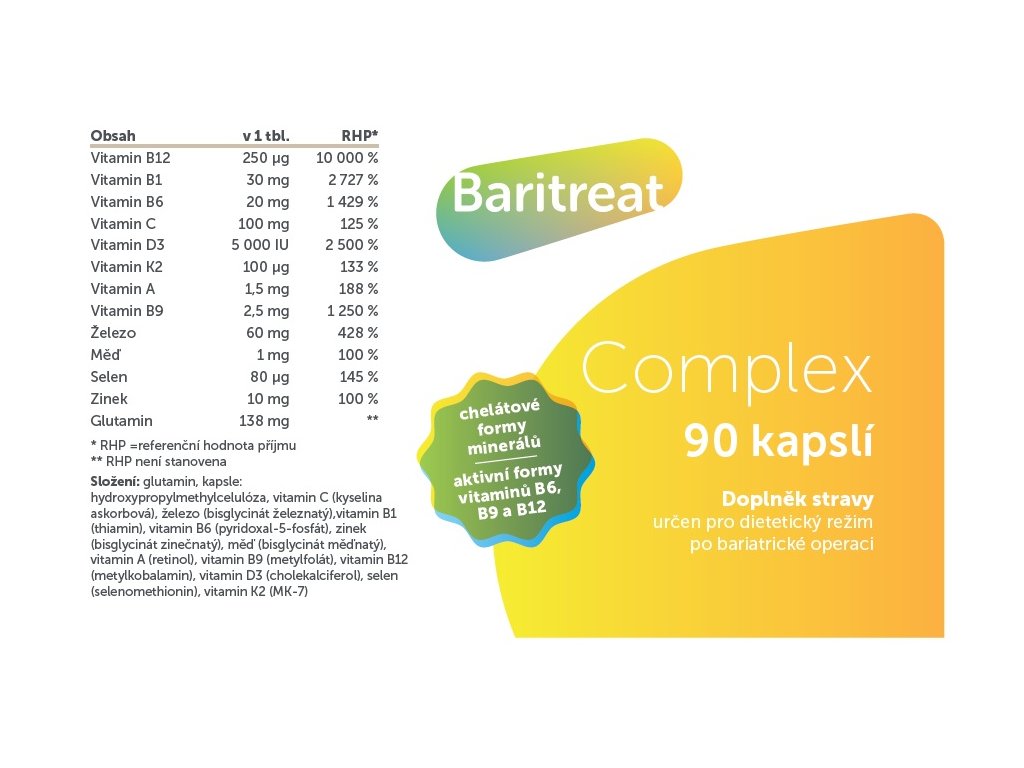 Baritreat Complex obsahuje pět základních mikro živin, které nejvíce chybí pacientům po bariatrických operacích. Zároveň je doplněn o další vitamíny a minerály, které chybí zejména pacientům po více invazivních zákrocích jako jsou biliopankreatická diverze nebo duodenal switch. Vhodné pro všechny bariatrické operace zejména bypassového typu, včetně BPD, duodenal switch, SADI a gastrické bypassy. Vhodné také pro pacienty, u kterých přetrvávají problémy s přijímáním pestré a vyvážené stravy.